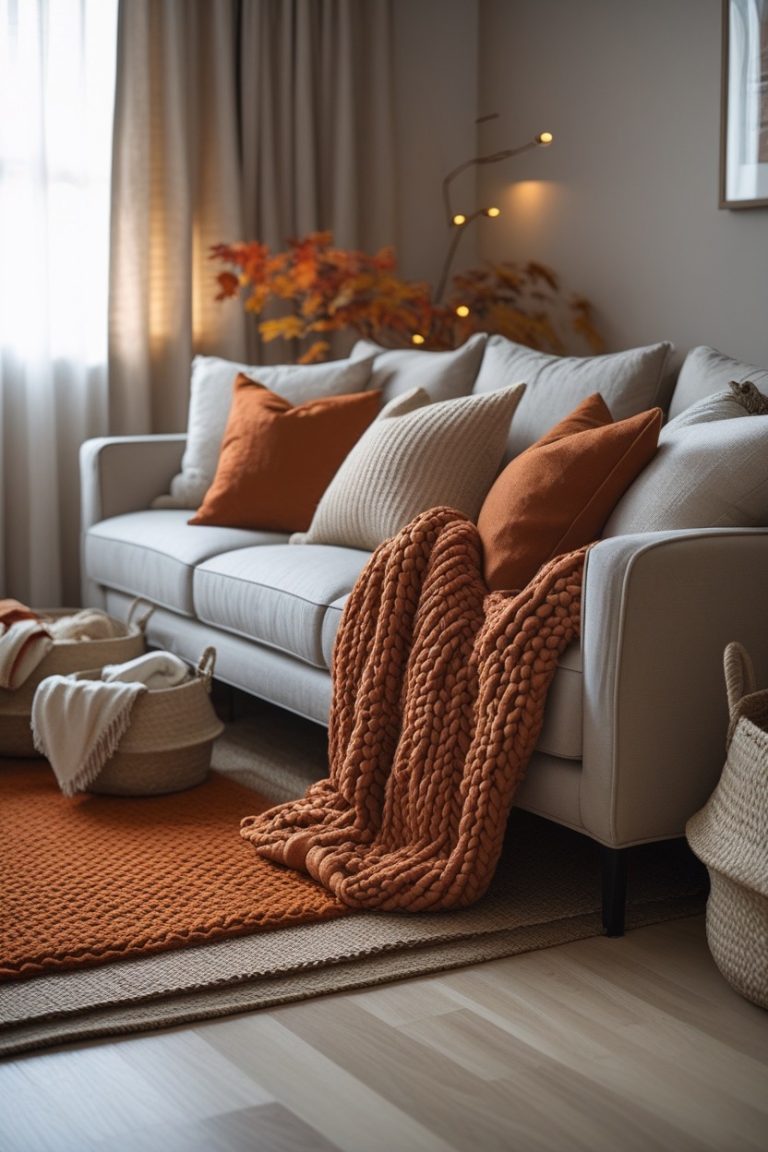 Keep your base sofa neutral and layer in burnt orange, ochre, or paprika pillows.