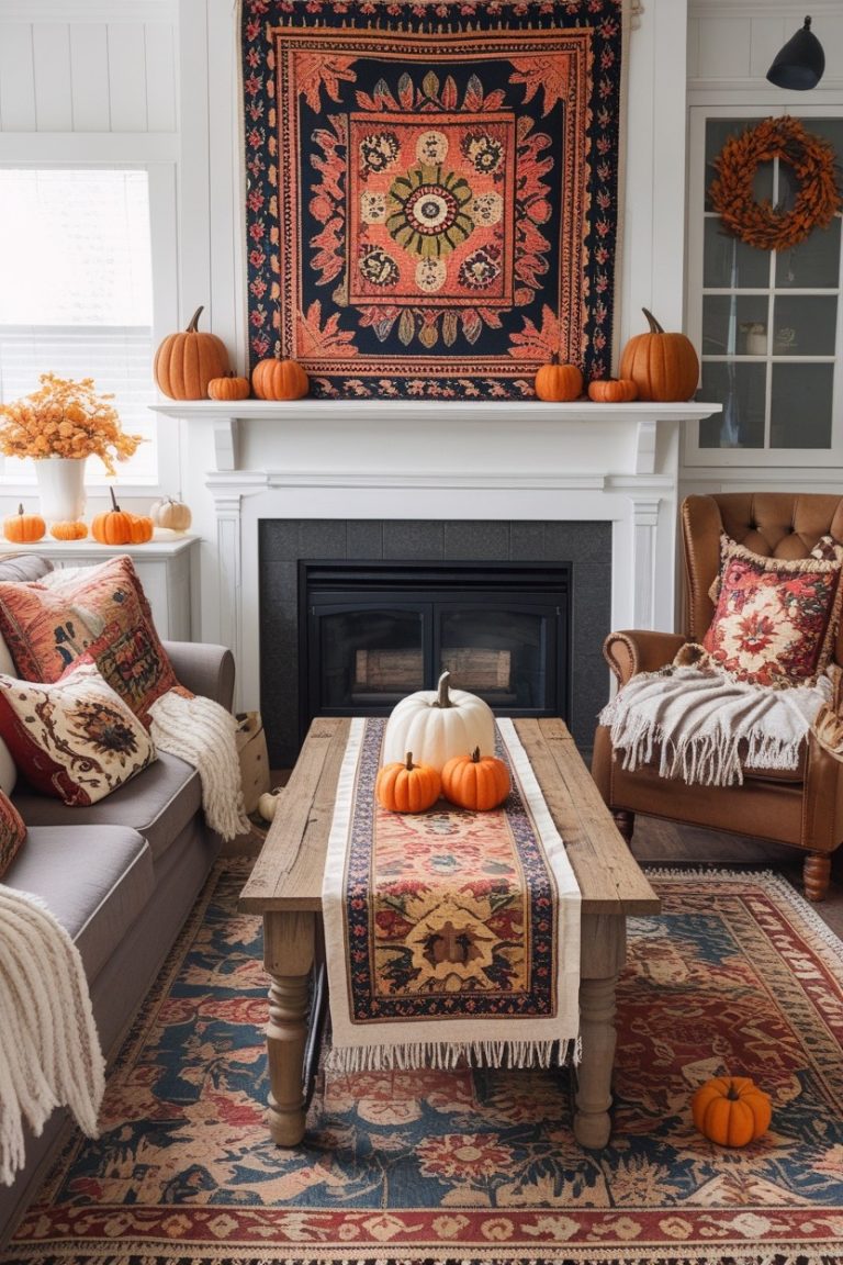 Drape a tapestry textile as a mantel scarf layered with pumpkins.