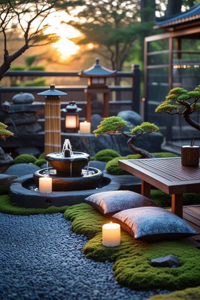 Dedicate one corner to a small raked sand area with stones symbolizing mountains and islands β a visual meditation that centers your energy.