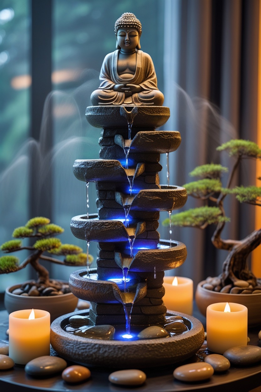 1. Buddha Multi-Tier Water Fountain – Perfect for meditation spaces, with cascading tiers and rainbow effects.