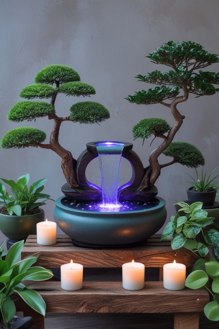 Pair a tabletop fountain with bonsai trees for symbolic balance.