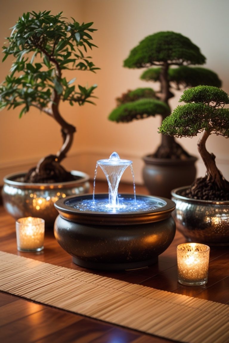 Pair a cascading fountain with bonsai for symbolic balance of growth and flow.