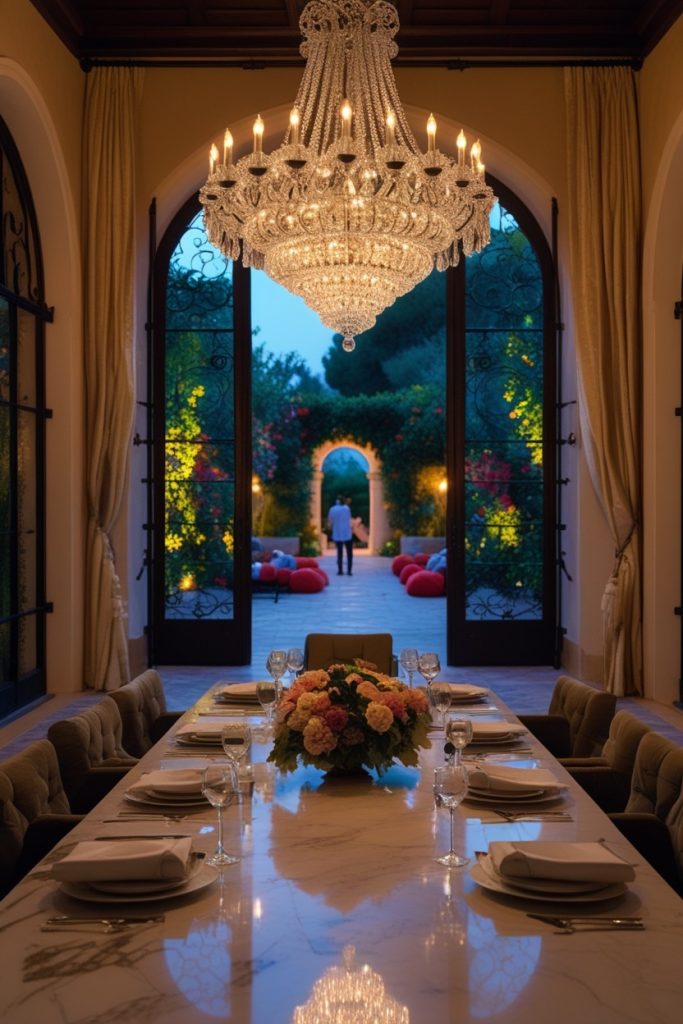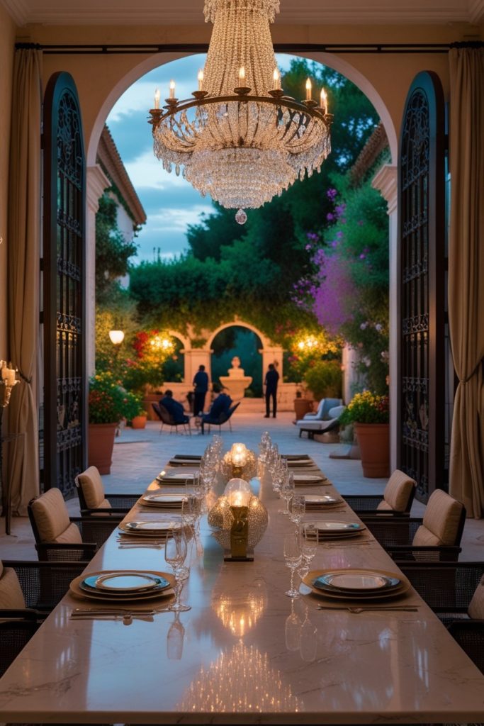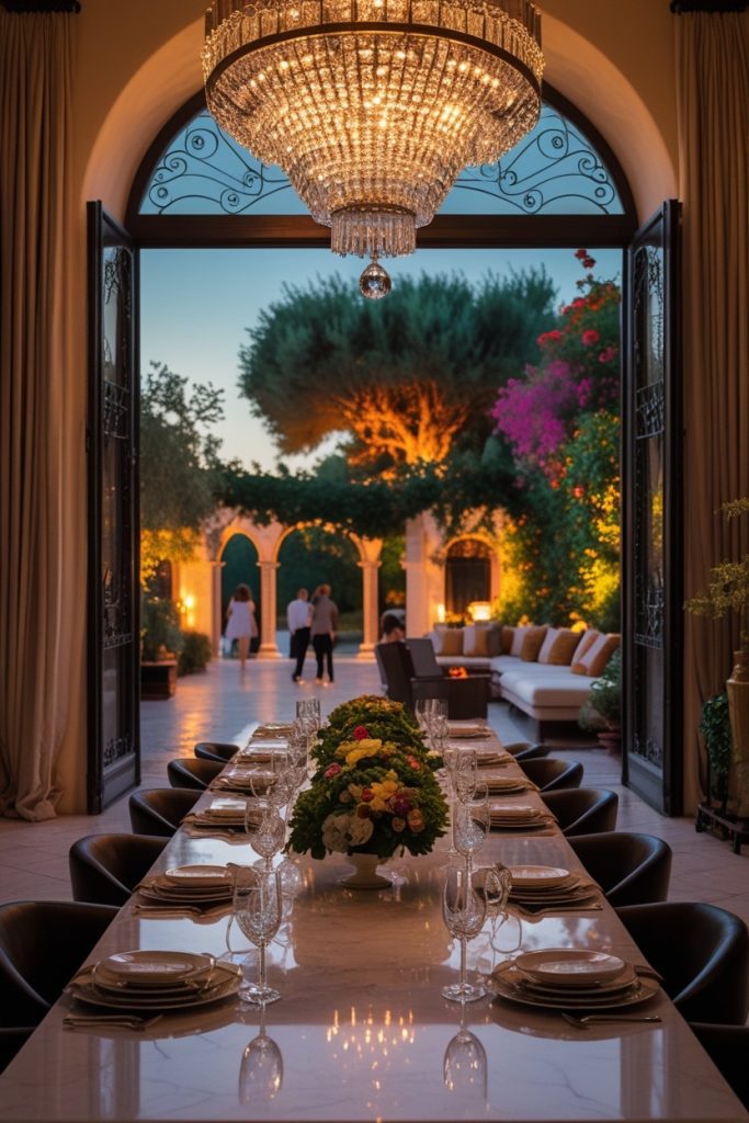 Blend indoor elegance with outdoor serenity by setting your dining area in a sunlit courtyard surrounded by greenery and soft lighting.