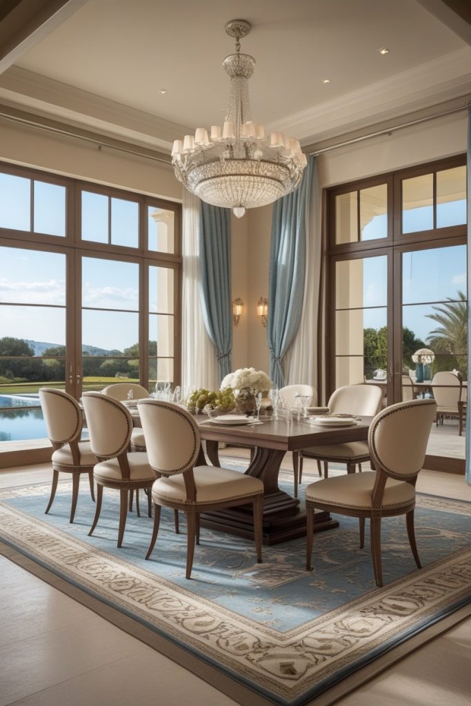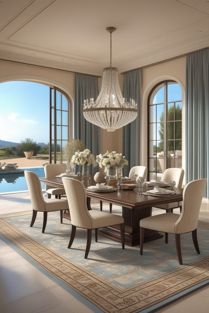 A bold chandelier instantly sets a luxurious tone. Choose crystal, gold, or sculptural lighting that complements your dining table’s style.