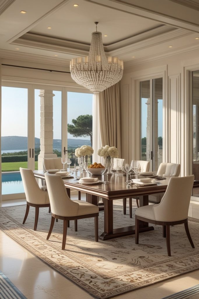 Glass doors that open to a terrace or garden make the dining area feel expansive and connected to nature.