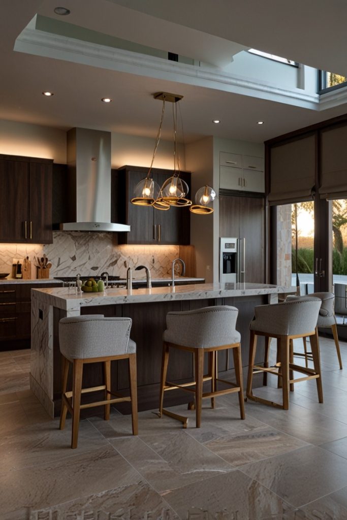 Oversized pendant lights or crystal chandeliers above the island add both illumination and opulence.