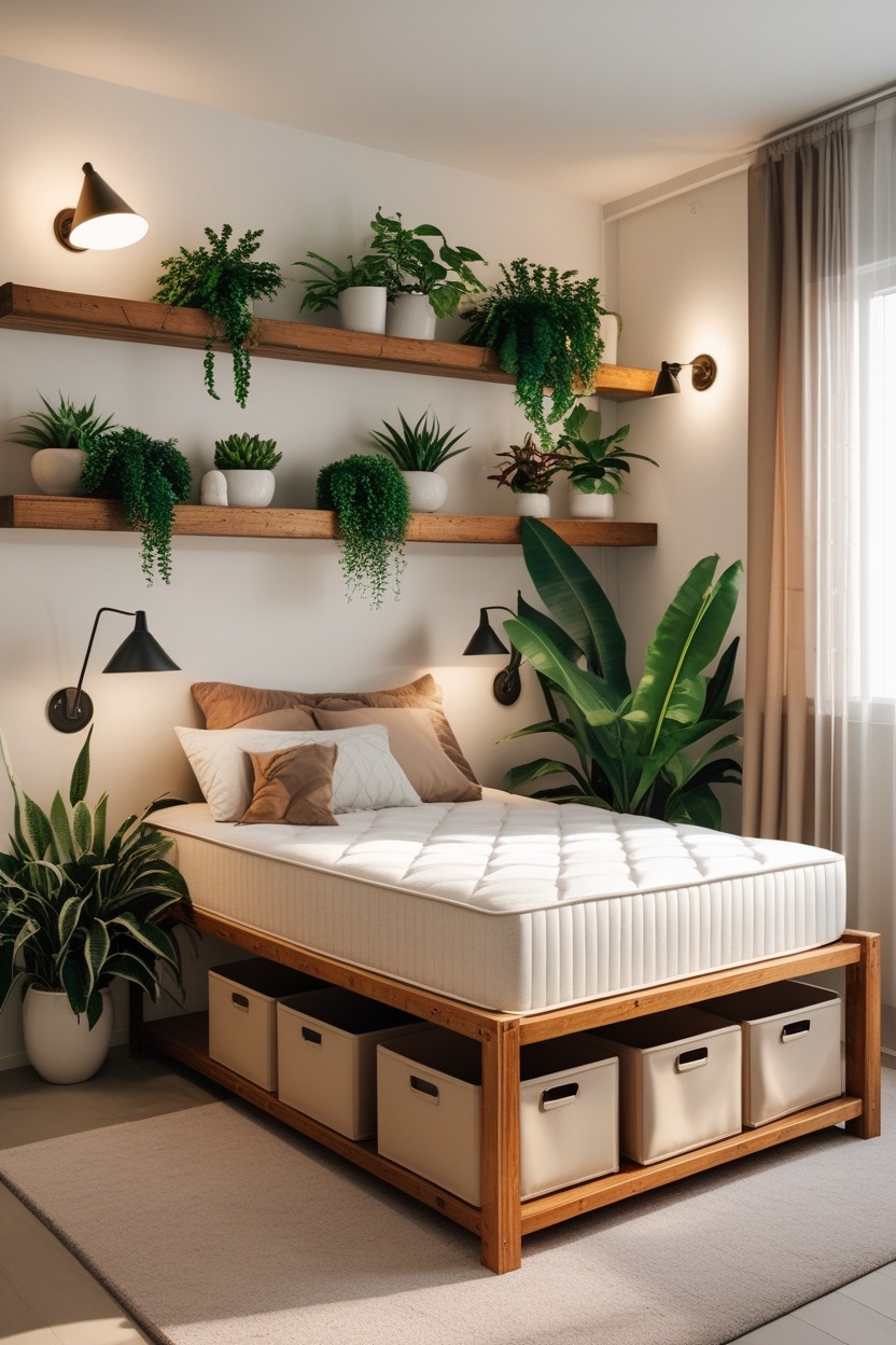 Mount shelves next to your bed to replace bulky nightstands. They free up floor space while giving you room for essentials.