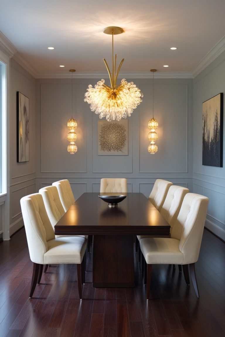 Warm metallic tones like brass and gold are timeless choices for elegant dining areas.