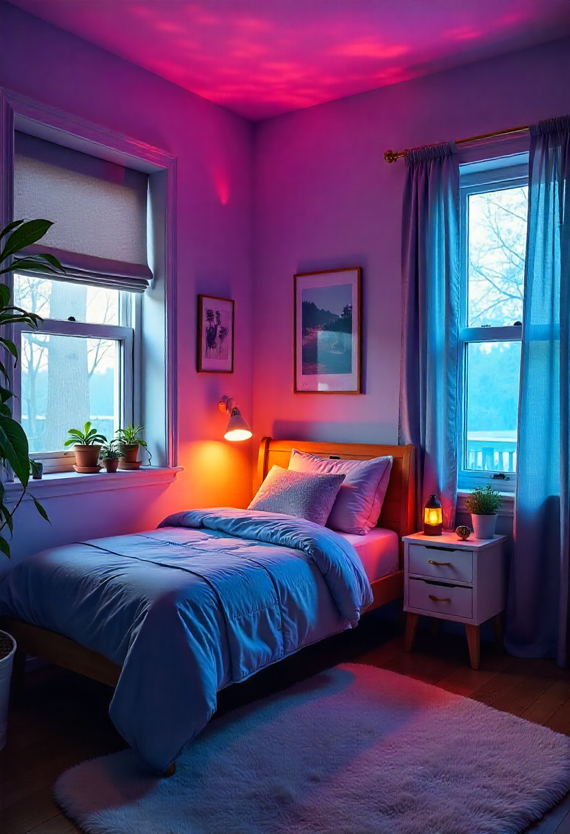Hang fairy lights or neon signs for a cozy, trendy vibe.