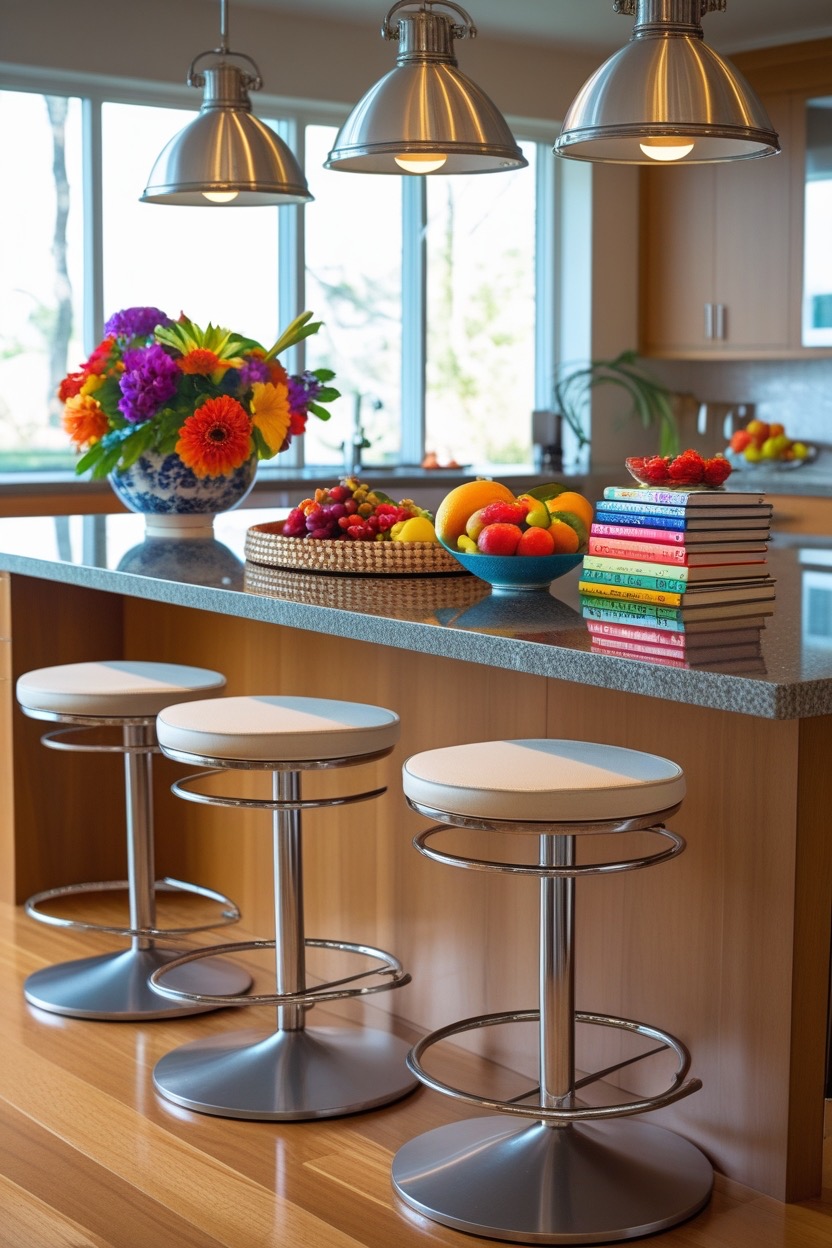 Choose stools with varying textures like leather, metal, or wood for a modern edge.