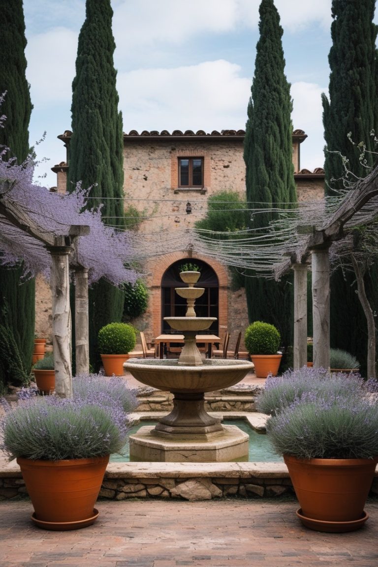 A central fountain surrounded by cobblestone instantly evokes an Italian villa courtyard.