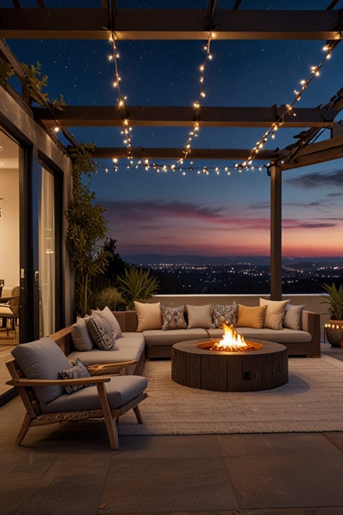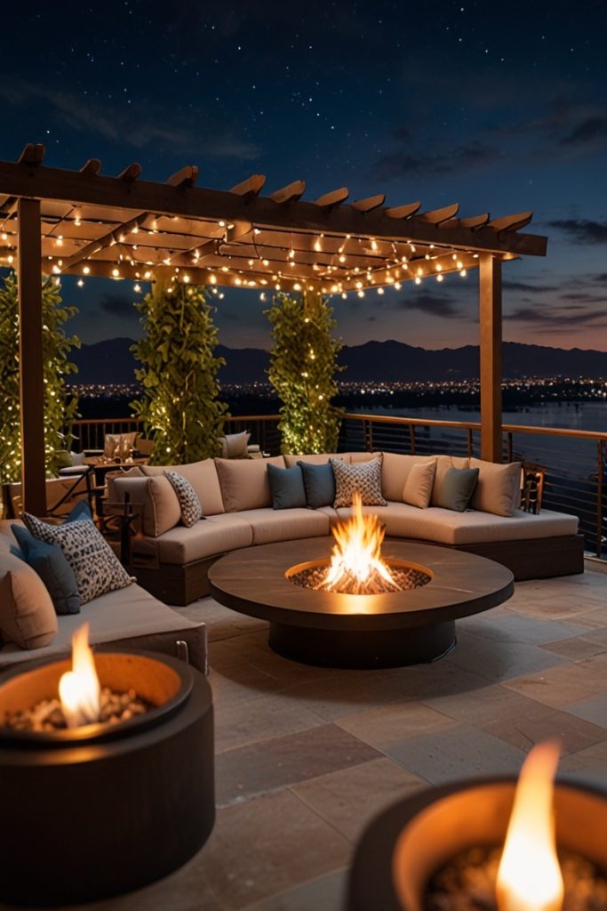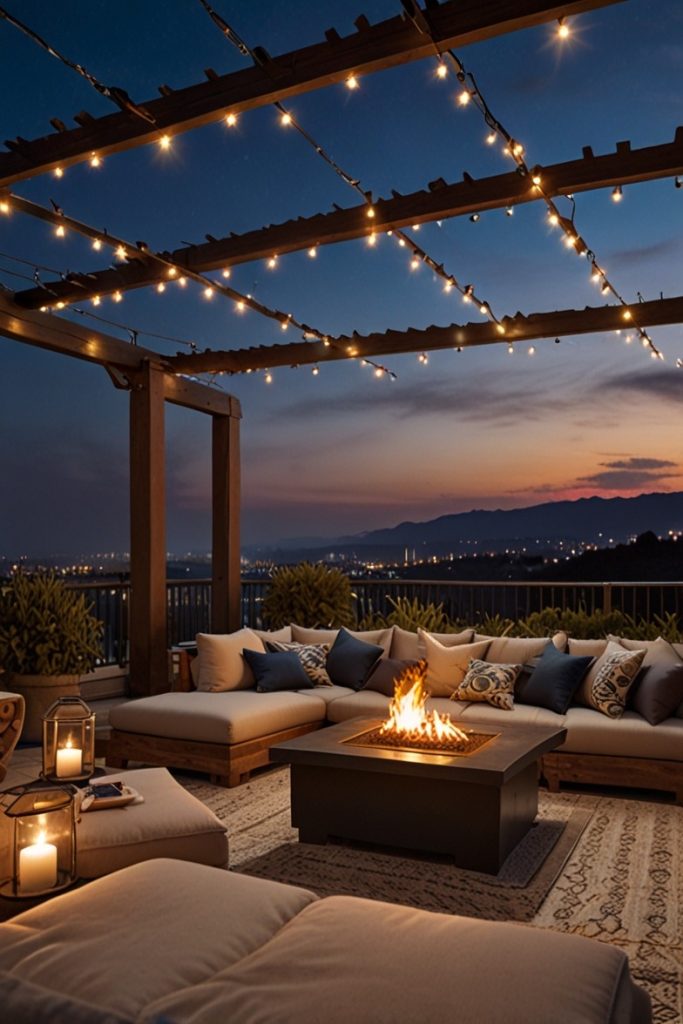A shaded pergola with string lights sets the stage for intimate rooftop dinners.
