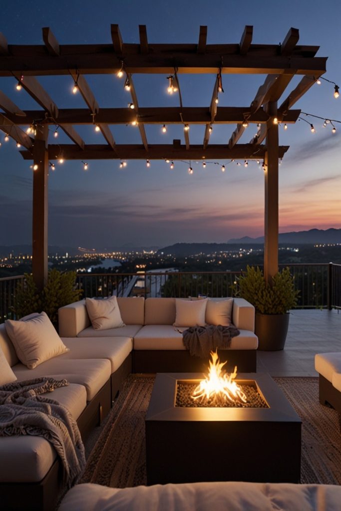 A shaded pergola with string lights sets the stage for intimate rooftop dinners.